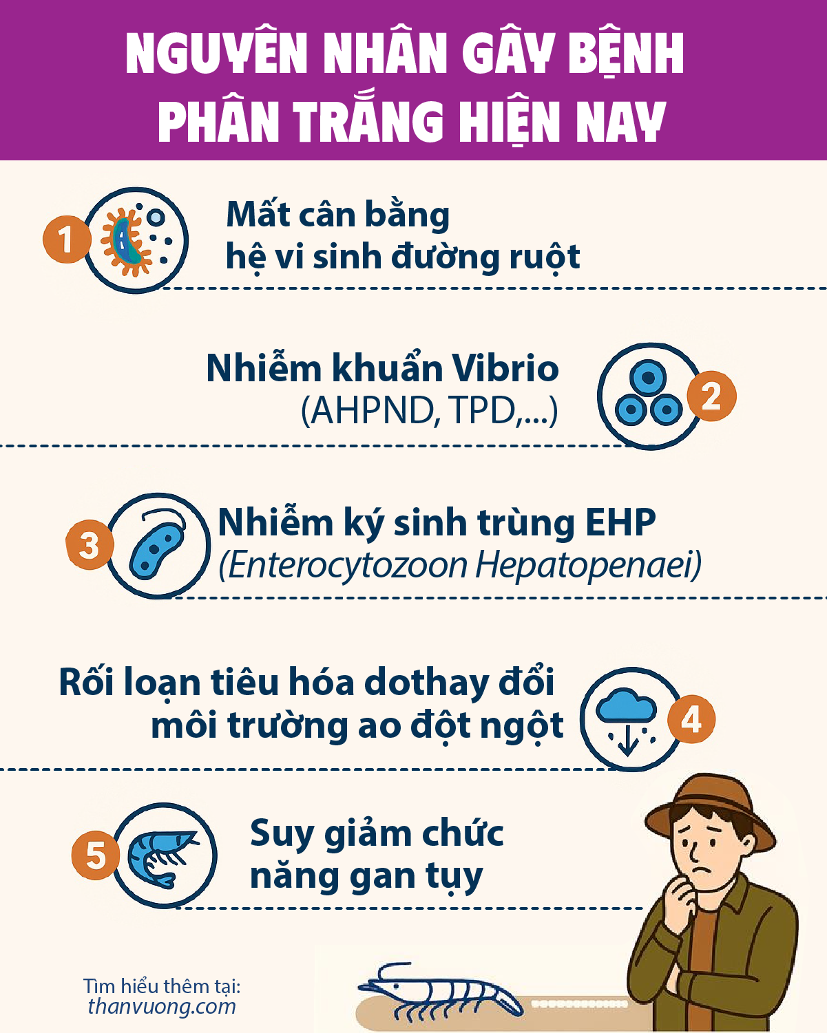 Bệnh phân trắng ở tôm là vấn đề đáng lo ngại, thường gây thiệt hại lớn cho người nuôi. Có nhiều nguyên nhân dẫn đến hiện tượng này, bao gồm: