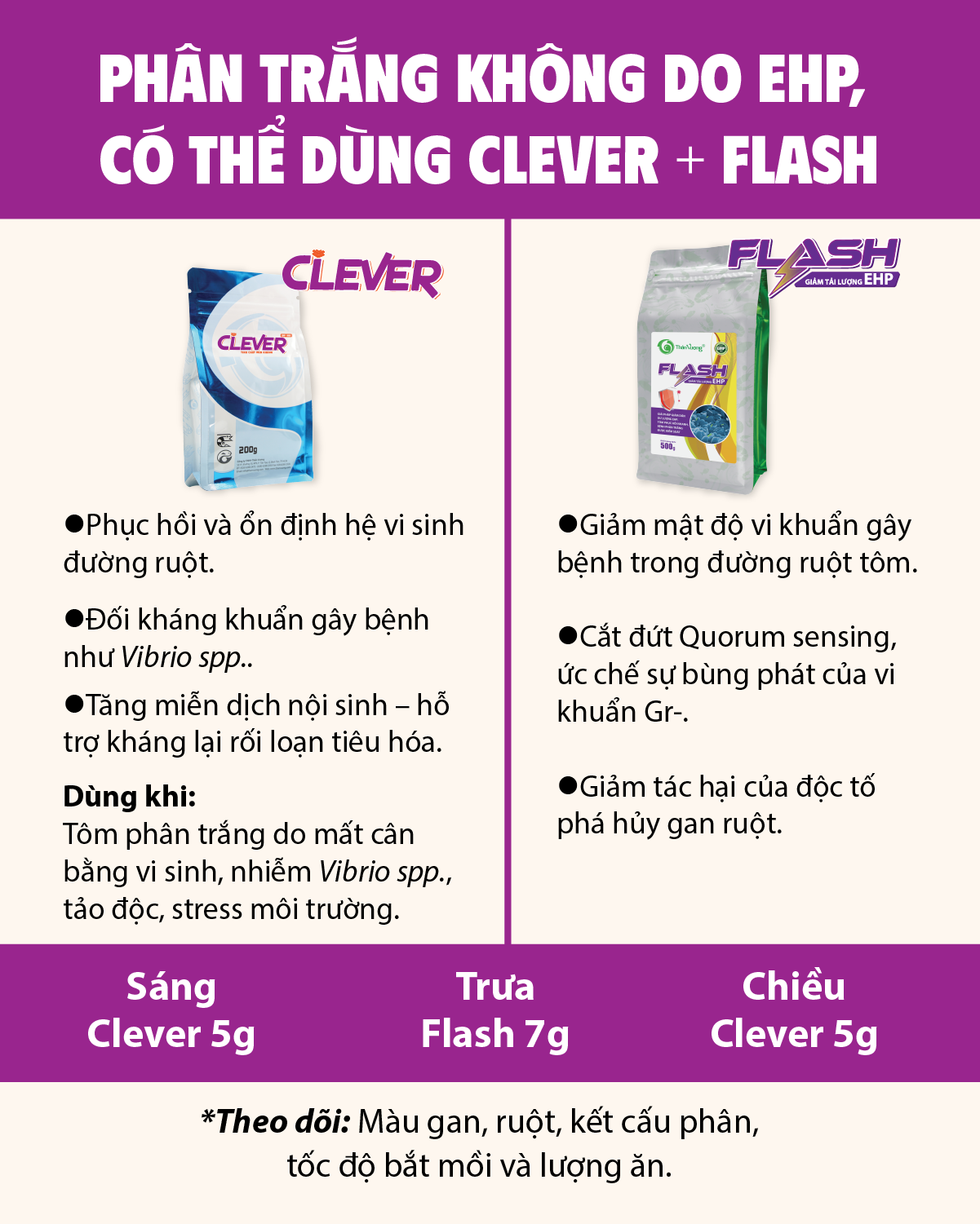 Nếu xác định nguyên nhân không phải do EHP, người nuôi có thể áp dụng giải pháp kết hợp sản phẩm CLEVER và FLASH để nhanh chóng cải thiện tình hình: